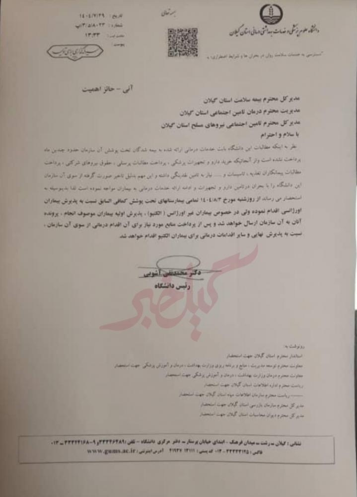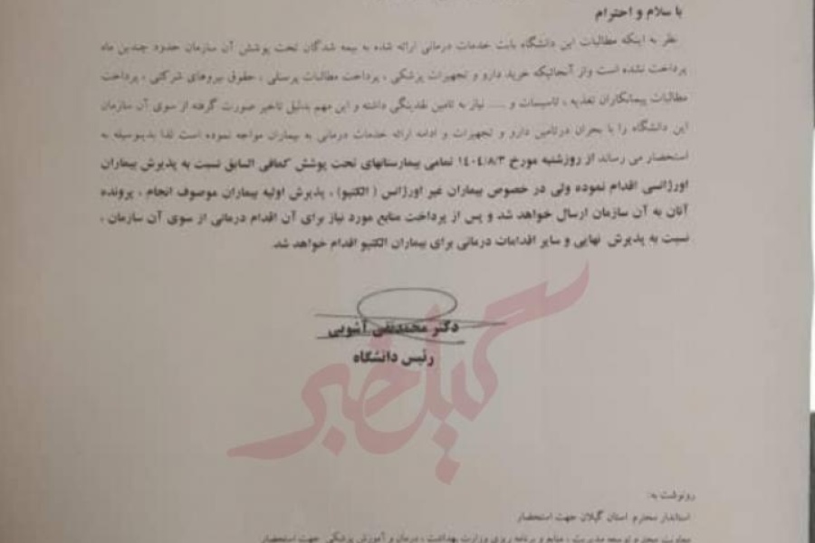 سلامت گیل/ به نقل از گیل خبر؛ بر اساس اعلام دانشگاه علوم پزشکی گیلان، بیش از نه ماه از آخرین پرداخت مطالبات بیمهها به دانشگاه میگذرد.